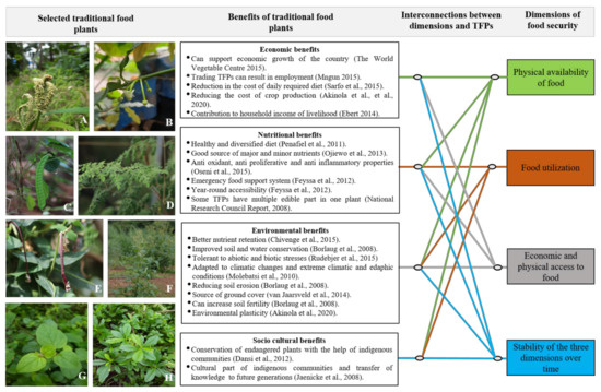 The congruence of traditional food plants with four dimensions of food security [44,58]. Examples of few traditional food plants: (A) Eleusine coracana (L.) Gaertn., (B) Garcinia madruno (Kunth) Hammel., (C) Canavalia ensiformis (L.) DC., (D) Moringa oleifera Lam., (E) Vigna unguiculata L. (Walp), (F) Amaranthus palmeri S. Watson, (G) Boerhavia diffusa L. and (H) Talinum triangulare (Jacq.).