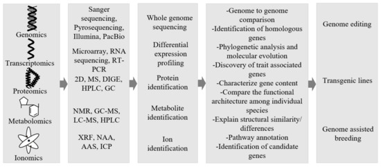 In the past two decades, we have seen an increased number of plants being sequenced [251]. Arabidopsis was the first model plant to be sequenced and it has provided significant insights about the various processes in the plants. Completion of its sequencing took several years [252]. However, innovations and improvements in the sequencing technologies have made it possible to sequence large and complex genomes in a shorter period of time at lower costs [253]. Therefore, many of the genomes of major crops have been recently sequenced within a relatively shorter span of time [254]. Many studies have focused on the genome sequences of the model crop plants, but recently we have also seen the application of omics technologies to non-model crops [255,256]. To date, whole genomes of more than 328 vascular plant species (comprising 323 angiosperms, 5 gymnosperms and 3 lycophytes), 3 non-vascular land plant species (2 mosses and 2 liverworts) and 60 green algae have been sequenced [257]. Genome sequencing technologies provide a holistic overview of the various genetic components of an organism [258]. Whole-genome sequencing studies of plants have led to the identification of thousands of genes and other regulatory elements controlling the traits [259]. The integration of the low-cost sequencing technologies with computational bioinformatics tools and high throughput phenotyping technologies can enhance the identification of genes that govern important agronomic traits relevant to the production of food and its quality [260,261]. The results of multi-omics studies provide a holistic overview of the various genes, proteins, metabolomes and ionomes of the organisms. Therefore, the convergence of multi-omics technologies provides an important opportunity to accelerate the task of identification of genes that control agronomically relevant traits in plants, including traditional food plants, and speed up improvement programs using both conventional breeding as well as modern revolutionary CRISPR/Cas9-mediated and other gene editing technologies [28]. Figure 2 provides an overview of the application of omics and gene editing tools to the traditional food plants for their improvement.