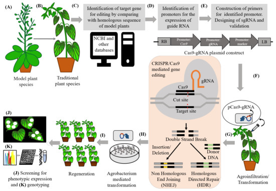 General workflow of CRISPR/Cas9 based gene editing in neglected crops for their improvement. (A) Extensively studied model plant species chosen for the ease of identification of homologous genes governing particular traits. (B) Underutilized, orphan or neglected traditional plants with undesirable traits can be edited for trait improvement, and biotic and abiotic stress tolerance. (C) Identification of target gene(s) for construction of sgRNA by comparing with a homologous sequence of model plants using databases such as the National Center for Biotechnology Information. (D) Identification of promoters for the expression of guide RNA. (E) Construction of plasmid carrying Cas9, gRNA and reporter gene in the promoter region with software Cas-Designer. (F) Agroinfiltration on young leaves with Agrobacterium harboring the construct Cas9-gRNA-Reporter. (G) Induction of precise breaks at the target sequence site(s). Endogenous machinery of cells repairs the breaks by non-homologous end joining (NHEJ) in the absence of a homologous repair template resulting insertions/deletions (indels) that disrupt/change/edit the target sequence or homology directed recombination by providing a homologous repair template, thereby inducing genomic mutations at the target locations. Other than CRISPR/Cas9 zinc finger nucleases (ZNF), mega nucleases and transcription activator-like effector nucleases (TALEN) are also used for gene editing, but the feasibility of CRISPR/Cas9 is greater when compared with other methods. (H) Validation of the efficiency of CRISPR/Cas9 for targeted mutagenesis in stable transgenic plants. The construct pCas9-gRNA-reporter introduced into nodal-explants after tissue culture using the Agrobacterium-mediated transformation method. (I) Regeneration of stable transgenic plants. (J) Screening of the regenerated plants for the mutated effect by checking their phenotypes. (K) Genotyping or putative transgenic plants containing Cas9 confirmed by PCR analysis [447,455,458].