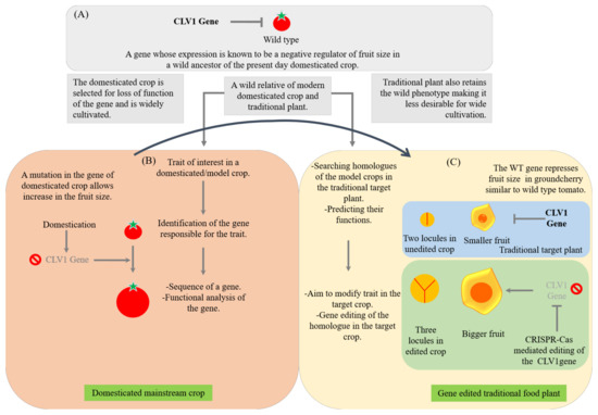 Example of rapid improvement of a traditional orphan food crop for larger fruits. The genomics information obtained from the tomato (a domesticated crop) genome sequencing and the functional analysis of the genes is directly translated to the traditional crop, groundcherry (a traditional food plant) [446]. A wild type gene CLV1 which is a negative regulator of fruit size in the domesticated tomato (A), a mutation during domestication has occurred in this gene leading to the formation of a bigger fruit size of domesticated tomato (B) and its homologue in a traditional food plant, groundcherry is targeted for gene editing for its improvement for bigger fruits (C).