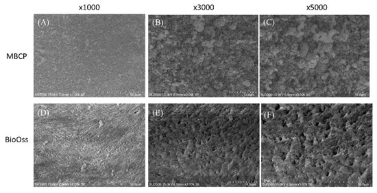 SEM images of MBCP and Bio-Oss at different magnifications (×1000, ×3000, and ×5000). (A–C) Morphology evaluation of MBCP at increasing magnification. (D–F) Morphology evaluation of Bio-Oss at increasing magnification.