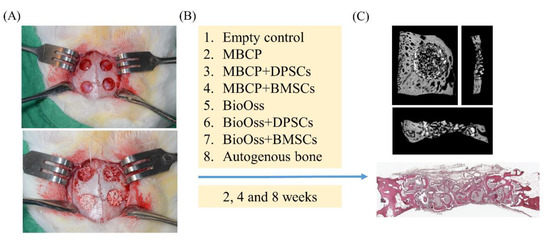 The osteogenic potential of bone grafting materials and MSCs for bone defect repair was investigated using a rabbit calvarial defect model (Figure 3). A total of 30 mg of MBCP and Bio-Oss bone grafting materials containing 1 × 106 DPSCs or BMSCs were implanted into 6-mm-diameter defects created using a trephine drill. After 2, 4, and 8 weeks of healing, all bone blocks were collected for micro-CT, histological, and histomorphometric assessments (Figure 3).