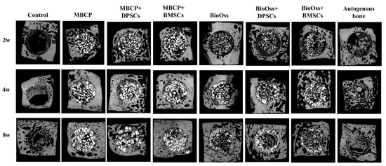 As shown in Figure 4, the micro-CT data revealed that the autogenous bone group showed more favorable growth than the other experimental groups during the whole healing period. In the control group, few newly formed bones were observed only around the border of the defects after 2 weeks of healing. At 4 and 8 weeks, new bone formation gradually increased from the border to the center area. In the MBCP and Bio-Oss groups, new bone formation was observed that gradually increased not only around the border of the defects but also in the central area of the defects from 2 to 8 weeks (Figure 4). After the incorporation of undifferentiated DPSCs or BMSCs, the rate of new bone formation and the number of bony bridges markedly increased compared with those in the control or scaffold-only groups. Moreover, from 2 to 8 weeks, the rate of new bone formation increased, and more bone grafting materials were gradually resorbed.