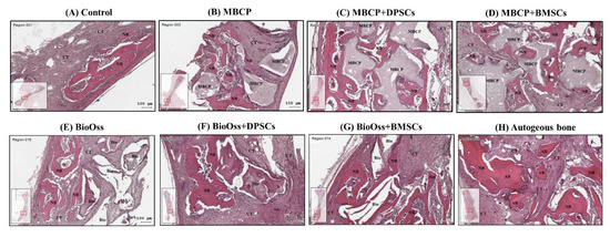 In all the bone defect specimens, no signs of inflammation, infection, and necrosis induced by bone grafting materials or MSCs were observed. The histological findings of the bone defect samples with new bone formation and surrounding tissues for the eight experimental groups are shown in Figure 6, Figure 7 and Figure 8.