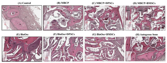 After 2 weeks of healing, the connective tissue mainly filled the bone defect in the empty control group (Figure 6A). In the border of the defect, fibrous tissue formation was evident, with little woven bone formation along the margin of the defect. In the central area of the defect, the space was almost occupied by connective tissue. By contrast, the autogenous bone graft group exhibited the highest bone healing capacity, with more bone bridges and island formation in the whole bone defect (Figure 6H). In the MBCP-only and Bio-Oss-only groups, even in the central area of the defect, new bone formation was observed surrounding the bone grafting materials (Figure 6B,E). This phenomenon indicates that the bone grafting materials exhibited osteoconductive capabilities during the bone healing process. As shown in Figure 6B–D, comparable new bone formation was observed among the MBCP-only, MBCP+DPSC, and MBCP+BMSC groups. Close contact between the new bone and MBCP grafting materials and more new bone growth in the porous MBCP were observed after incorporating the DPSCs and BMSCs. Moreover, the Bio-Oss+DPSC and Bio-Oss+BMSC groups showed more new bone formation than the Bio-Oss-only group (Figure 6E–G).