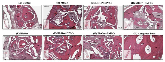 Overall, the histological and histomorphometric results indicated a higher new bone formation capacity in the MBCP+DPSC, MBCP+BMSC, Bio-Oss+DPSC, Bio-Oss+BMSC, and autogenous bone groups than in the empty control, MBCP-only, and Bio-Oss-only groups at week 2 and week 4. However, comparable results were observed among the MBCP-only, MBCP+DPSC, MBCP+BMSC, Bio-Oss-only, Bio-Oss+DPSC, and Bio-Oss+BMSC groups after 8 weeks of healing (Figure 6, Figure 7, Figure 8 and Figure 9).