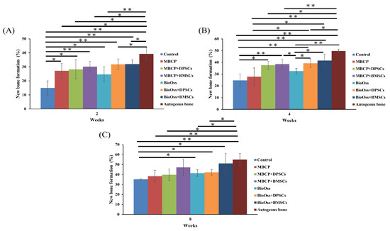 Statistical results of the bone volume/tissue volume (BV/TV) values after 2, 4, and 8 weeks of healing (* p < 0.05 and ** p < 0.01). (A) The BV/TV values in the autogenous bone group are significantly higher than other groups after 2 weeks of healing. (B) The BV/TV values of the MBCP+BMSCs, Bio-Oss+BMSCs and autogenous bone groups were no significantly different after 4 weeks of healing. (C) Similar BV/TV values were demonstrated among MBCP+DPSCs, MBCP+BMSCs, Bio-Oss+DPSCs, Bio-Oss+BMSCs and autogenous bone groups after 8 weeks of healing.