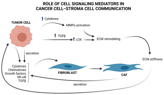 Brief overview of cell signaling mediators in cancer cell–stroma cell communication and ECM remodeling. Tumor cells produce cytokines, chemokines, NF-κB, and TGFβ, that “activate” stromal progenitors, such as fibroblasts, into CAFs and produce, in turn, cytokines and TGFβ, influencing tumor cell functions. TGFβ upregulation in cancer cells provokes an increment in LOX, which in turn affects ECM remodeling by changing the collagen organization and provoking ECM stiffness that induces the mechanical activation of latent TGFβ. An increased amount of cytokines by tumor cells induces MMPs activation that contributes to ECM remodeling and sustains tumor progress.