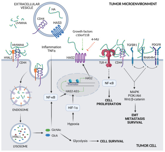 Overview of HA metabolism and interaction with membrane receptors. Synthesis of HA by HAS2, the main synthetic enzyme in cancer cells, is increased by inflammatory agents, such as TNFα, via the NF-κB signaling pathway. Induction of HAS2 also occurs due to various growth factors and the secreted protein c10orf118 in a not yet fully described mechanism. Pharmacological agents, such as 4-MU, inhibit HA synthesis and downregulate HAS2. A binding to HYAL2 and CD44 and endocytosis lead to the degradation of HMWHA; HYAL2 cuts HMWHA into fragments (LMWHA) at the plasma membrane which, in turn, are internalized into the cell via endocytosis and further degraded by HYAL1 in lysosomes. The produced sugars, GlcNAc and GlcA, may be recycled in cell energy metabolism, i.e., glycolysis, or control HAS2-AS1 expression via NF-κB. HAS2-AS1 is also regulated by hypoxia via HIF-1α. Tumor cells are secreted in tumor microenvironment extracellular vesicles that contain HA, HAS3, and CD44 that can be captured by target cells. The HA of the tumor microenvironment can bind to different cell membrane receptors. The HA–TLR-4 complex signals the NF-κB pathway, supporting cell proliferation, whereas HA-CD44 and HA-RHAMM interact with either TGFβRI and PDGFR, promoting EMT and cell survival and metastasis.