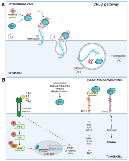 (A) CLU mediates clearance of misfolded proteins through the chaperone- and receptor-mediated extracellular protein degradation (CRED) pathway. CLU binds a misfolded protein and then interacts with the HS chains membrane PGs by electrostatic interactions (I); the CLU–client protein-receptor is endocytosed (II) and delivered to the lysosome (III) for intracellular degradation (IV). (B) Intracellular signaling pathways triggered by CLU after surface receptors binding. CLU inhibits the TAK1– NF-κB signaling axis triggered by inflammatory cytokines. CLU facilitates eHSP90 binding to LRP1, enhancing the activation of ERK, AKT, and NF-κB and promoting EMT. Finally, CLU binds LRP2 and promotes cell survival through PI3K/AKT activation.