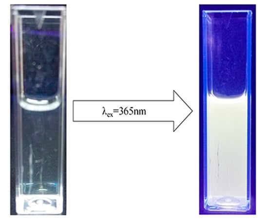 Fluorescence of ZnO quantum dots at λex = 365 nm. Left: image of ZnO quantum dots under white light; right: image of ZnO quantum dots under 365-nm ultraviolet light.