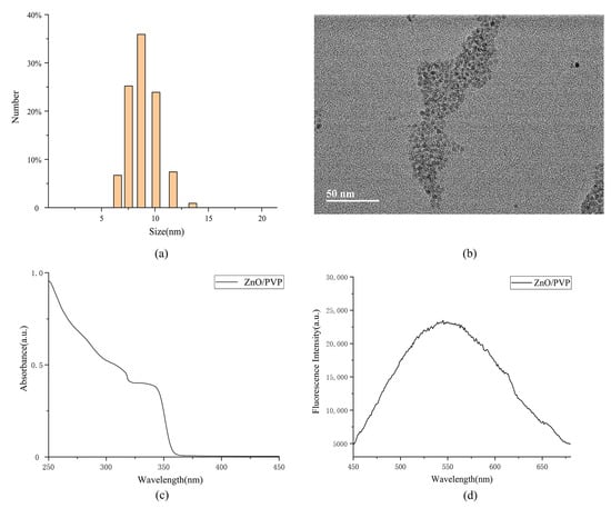 Characterizations of the ZnO/PVP QDs. (a) Particle sizes of the ZnO/PVP QDs as measured by DLS, (b) TEM image of the ZnO/PVP QDs, (c) UV-Vis absorption spectra of the ZnO/PVP QDs, and (d) fluorescence spectra of the ZnO/PVP QDs.