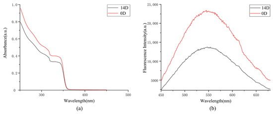 Absorption and fluorescence spectra of the ZnO/PVP QDs stored in an ethanol solution for two weeks. (a) absorption spectra of the ZnO/PVP QDs and (b) fluorescence spectra of the ZnO/PVP QDs.