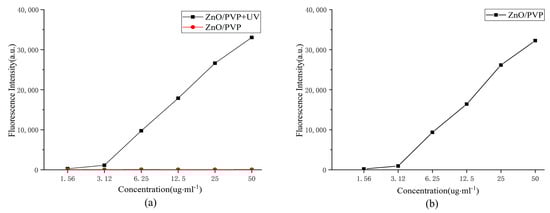 The ROS levels were measured using dissolved DCFH-DA, a fluorescent dye that enables the visualization of ROS. The DCFH-DA was dissolved in dimethyl sulfoxide to obtain a 48-µg/mL DCFH-DA solution. Specific volumes (100 µL) of different concentrations of ZnO/PVP solution (1.56, 3.125, 6.25, 12.5, 25, and 50 µg/mL) were pipetted into the wells of a 96-well plate, and 10 µL of DCFH-DA (48 µg/mL) was added to each well. UV light at a wavelength of 365 nm (the source was situated 5 cm above the plate) was used to irradiate the 96-well plate for 5 and 10 min. ROS detection was performed via a fluorescence quantitative analysis using a fluorescence microplate reader (Fluoroskan, FL, USA).