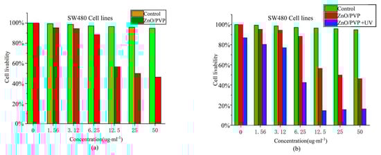 To evaluate the PDT efficacy of the ZnO/PVP QDs, the viabilities of SW480 and HEK293T cells subjected to UV irradiation were evaluated using an MTT assay. ZnO/PVP showed excellent biocompatibility, with no remarkable changes in cell viabilities under suitable concentrations and without UV treatment. However, ZnO/PVP QDs subjected to UV irradiation showed evident tumor inhibition. Furthermore, the cell mortalities gradually increased with the increasing concentrations, with the cell viability decreasing to 15% at a concentration of 50 μg/mL. Near-complete apoptotic tumor cells were also observed, indicating that ZnO QDs have excellent photodynamic effects in vitro. ZnO/PVP showed evident tumor inhibitory effects at a concentration of 6.25 μg/mL when subjected to UV irradiation. Additionally, the cell survival rate of the group at this concentration was 45% lower than that of the no UV treatment group at the same concentration (Figure 5b). The percentages of apoptotic and necrotic SW480 and HEK-293T cells were analyzed by flow cytometry (Figure S3). The number of necrotic cells decreased after treatment with 25-µg/mL ZnO QDs in both cell types.