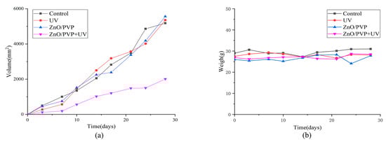 After dividing tumor-bearing nude mice into four groups, the tumors were measured and weighed every 3 days. The tumor volumes of the control, UV, ZnO/PVP, and ZnO/PVP + UV groups were 5180 ± 759, 5356 ± 795, 5562 ± 480, and 2011 ± 37 mm3, respectively, on day 28 (Figure 6). The tumor inhibition rate of the ZnO/PVP+UV group was 61.1%, which was significantly higher than that of the control, UV, and ZnO/PVP groups (p < 0.05 in all instances). Moreover, the tumor inhibition effects of ZnO/PVP were observed in the early stages. The sizes of the tumors in nude mice were visible to the naked eye after 7 days (Figure 7 and Table 1).