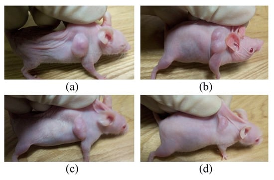Changes in the tumors of tumor-bearing mice on day 7. (a) Control group, (b) UV group, (c) ZnO/PVP group, and (d) ZnO/PVP+UV group.