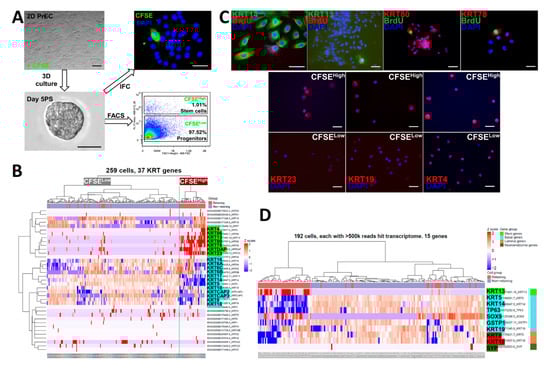 Both structural and non-structural functions of keratins have been identified, and several keratins are associated with stem cells and cancers [,,,,,,]. Furthermore, keratin profiling has been previously used to study prostate development and epithelial cell differentiation [,,]. To investigate the keratin gene profiles in prostate stem and progenitor cells, we pre-labeled pooled primary prostate epithelial cells (PrECs) from three normal prostate tissues with BrdU or 5(6)-carboxyfluorescein N-hydroxysuccinimidyl ester (CFSE) followed by wash-out in 3D Matrigel culture for 5 days during spheroid formation. Prostaspheres were dispersed into single cells, and CFSEHigh prostate stem-like cells (1.01%) were separated from CFSELow progenitor cells (97.52%) by FACS (Figure 1A) [,]. The cells were captured using the Fluidigm C1 platform that although isolating and tagging fewer single cells than other systems, permits greater transcriptome resolution with superior coverage across transcripts including gene isoforms. Initial heatmap clustering of 37 keratin genes in the two sorted populations revealed enrichment of KRT13, 23, 80, 78, 86, and 4 in the CFSEHigh prostate stem-like cells, while KRT6, 17, 14, 5, 8, and 18 were enriched in CFSELow progenitor cells (Figure 1B). Immunostaining confirmed the enrichment of keratins 13, 23, 4, 78, 80, and 19 at the protein level in BrdU label retaining or CFSEHigh prostate stem cells (Figure 1C). To better identify the cell subpopulations, we undertook heatmap clustering with selected known gene markers for stem, basal, luminal, and neuroendocrine cells (Figure 1D). Enrichment of the stem cell marker gene KRT13 was confirmed in CFSEHigh label-retaining prostate stem cells, while basal marker genes KRT5, KRT14, KRT19, TP63, SOX9, GSTP1, luminal genes KRT8/18, and neuroendocrine gene SYP were enriched in CFSELow non-label-retaining prostate progenitor cells, suggesting a stem cell-driven epithelial cell lineage commitment during prostasphere formation. Of note, transcription factor SOX9 was enriched in both label-retaining stem cells and non-retaining progenitor cells.