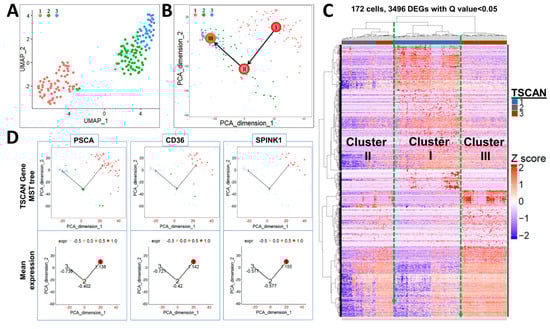In response to extrinsic signals from the niches, stem cells residing in the quiescent state become activated and enter the cell cycle to progress to lineage-committed daughter progenitor cells [,,]. As such, we hypothesized that CFSEHigh cells may represent a heterogeneous mix of stem cells at different quiescent and activated stages. Indeed, Fluidigm single-cell RNA-seq of 172 CFSEHigh cells followed by uniform manifold approximation and projection (UMAP) and Tool of Single Cell Analysis (TSCAN) identified three major clusters (Figure 2A,B), which were further confirmed by unsupervised heatmap clustering (Figure 2C). Cell hierarchical clustering (cluster I → II → III) was reconstructed by a minimum spanning tree (MST) incorporated with the traveling salesman problem algorithm to minimize the distance linking cell clusters. A pseudo-temporal ordering score was used to determine starting and ending points of the tree (Figure 2B), which closely mimics the true biological time []. Based on these analyses, cluster I, the originating cells, are predicted to be quiescent stem-like cells, yielding cluster II, likely active stem cells that lead to cluster III, which are proposed as bipotent progenitor cells.