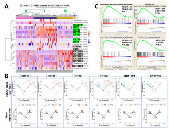 Heatmap clustering of 21 keratin genes in 172 CFSEHigh sorted prostasphere cells was next used to further distinguish the three cell clusters found in the label-retaining stem-like cell population. Keratin gene profiles revealed the enrichment of KRT13, 23, 80, 78, and 4 in cluster I stem cells (Figure 3A, middle). In contrast, these keratins were sharply decreased in both clusters II (left) and III (right), permitting easy identification of the proposed quiescent stem cells. Clusters II and III, proposed as active stem cells and bipotent progenitors, respectively, were further differentiated by increased KRT16(16P2, 16P4, 16P5), 17(17P2, 17P3, 17P6), and 6 gene expressions in cluster III, which were not heightened in cluster II (Figure 3A). TSCAN was next employed to trace relative keratin gene expression levels in the three clusters in pseudo-time from cluster I → II → III, which is graphically illustrated by circle size for each denoted cell (Figure 3B). Enrichment of KRT13, 80, 78, and 23 was confirmed for cluster I quiescent stem cells, while KRT16P4 and 17P6 were enriched in clusters III bipotent progenitor cells. Active stem cells in cluster II express decreased levels of stemness keratins KRT13, 80, 78, and 23 enriched in cluster I with increased levels of KRT16 (16P2, 16P4, 16P5) and 17 (17P2, 17P3, 17P6) enriched in cluster III. Together, these sequential changes in keratin genes as the stem cells enter lineage commitment further supports the progression of cell hierarchy from cluster I → II → III. Furthermore, gene set enrichment analysis (GSEA) revealed the enrichment of stem-cell-related Notch, Toll-like receptor, autophagy, and lysosome pathways in cluster I vs. cluster III (Figure 3C). These are pathways previously associated with stemness in the prostate and other tissues [,,]. Collectively, these data demonstrate that the keratin profiles rapidly change as the stem cells lineage commit from quiescence to active stem cells and bipotent progenitor cells.