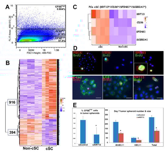 RNA-seq reveals differentially expressed genes in cancer stem-like cells and vs. non-stem cells in tumor spheroids of patient PCa specimens. (A) Cancer stem-like cells (cSC; (CFSEHigh) and non-cSC (CFSElow) from spheroids of three PCa specimens were separated by FACS. (B) Following RNA-seq of the sorted cells, unsupervised transcriptome profiling identified 1310 differentially expressed genes (Q value < 0.05); 916 enriched in cSCs and 394 enriched in non-cSCs. Sequencing of the non-cSC fractions from three patients were performed in duplicate, highlighting data consistency. For the cSC fraction, one patient sample was sequenced in duplicate, and the other two were sequenced in singlet. (C) Heatmap of CD36, KRT13, SPINK1, and SCGB2A1 expression shows enrichment in cSCs vs. non-cSCs. (D) ICC documents that PSCA, CD36, and SPINK1 proteins (red) colocalized with BrdU-labeled (green) cSC cells in the 3D cultured tumor spheroids. Similar to normal prostate stem cells, the cSCs exhibit decreased E-cadherin, increased LC3 and KRT13 (Hu et al., 2017), which together identifies unique features of PCa-derived cancer stem-like cells. (E) siRNA knockdown of KRT13 significantly decreased the percentage of CFSEHigh cells in tumor spheroids (left) and tumor spheroid formation (right). * p < 0.05 vs. siControl, N = 3.