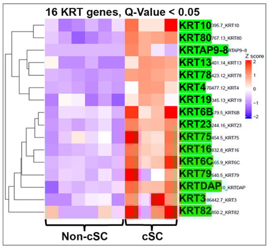 Heatmap clustering of keratin genes in PCa stem-like cells (cSCs) and the non-stem cells in tumor spheroids from PCa specimens. RNA-seq followed by heatmap clustering analysis shows that in addition to normal stem cell-enriched keratins (KRT13, 23, 80, 78, 4), KRT10, 19, 6C, 75, 16, 79, 3, and 82 also were enriched in cancer stem-like cells relative to expression levels in the non-cSC population. Q-value < 0.05.