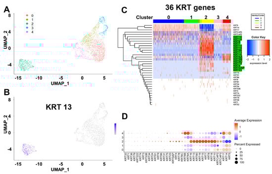Keratin profiling in tumor spheroids using single-cell RNA-seq identifies cancer stem-like cells. (A,B) Uniform manifold approximation and projection (UMAP) clustering defined five clusters in cancer cells, identifying cluster 2 as cancer stem-like cells enriched for stemness markers, including KRT13. (C) Keratin gene profiling by heatmap and (D) dot-plot analyses identified a group of keratin genes enriched in the cluster 2 cancer stem-like cells.