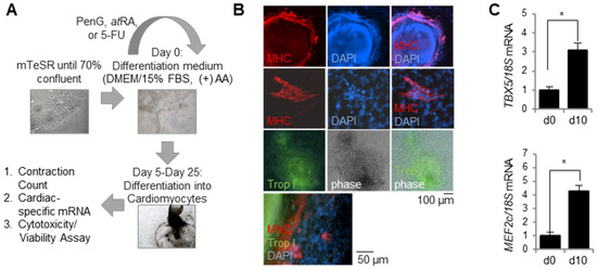 Prior to testing the efficacy of the hiPSC-based EST, RIV9 hiPSC cultures were evaluated for their cardiac differentiation potential and efficiency following a 25 day differentiation protocol (Figure 1A). Successful differentiation into cardiomyocytes was visually confirmed with the generation of active contractile clusters on days 20 and 25 of differentiation. The cardiac identity of these clusters was confirmed molecularly via mature cardiomyocyte markers. Immunocytochemistry stains of differentiated cell cultures on day 25 revealed positive staining for myosin heavy chain (MHC) and Troponin I (Trop I) in contractile clusters (Figure 1B). Moreover, RT-PCR analysis of cardiac-specific transcription factors at differentiation day 10 showed a significant upregulation of TBX5 and MEF2c in hiPSC cultures induced to a cardiac cell fate (Figure 1C). Together, these results indicated that RIV9 hiPSCs successfully and efficiently differentiate into cardiomyocytes under the appropriate culture conditions.