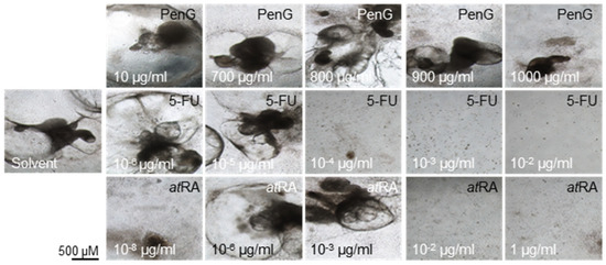 atRA-treated cells failed to form contractile clusters at concentrations above 1 × 10−3 μg/mL (Figure 2) and exhibited significantly reduced contractile activity in doses above 1 × 10−8 μg/mL (Figure 3). The resulting ID50 value for atRA on day 25 was 9.33 × 10−7 μg/mL. In contrast, treatment with PenG did not inhibit the formation of contractile structures (Figure 2) and did not negatively impact contractile activity at most of the tested concentrations (Figure 3). Dips in contractile incidence were only observed at doses beyond 700 μg/mL. An ID50 was determined at 739.9 μg/mL.
