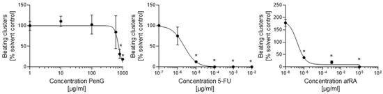 Treatment with embryotoxicants 5-FU and atRA impeded cardiomyocyte differentiation. hiPSCs were treated with different concentrations of 5-FU, atRA, or PenG and evaluated for differentiation inhibition by visually scoring the number of actively contracting cardiomyocyte clusters. Each data point represents the mean of three independent experiments ± SD. *: p < 0.05 = the lowest concentration significantly below the untreated control group as determined by One-Way ANOVA. hiPSC, human induced pluripotent stem cell; 5-FU, 5-fluorouracil; atRA, all-trans retinoic acid; PenG, penicillin G.