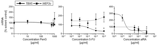 Cells exposed to atRA also showed a dose-dependent downregulation of TBX5 mRNA expression. In these cultures, exposure featured significantly downregulated TBX5 beyond the determined ID50 value of 3.28 × 10−6 μg/mL (Figure 5). However, atRA treatment at tested concentrations lower than 1 × 10−6 μg/mL yielded a significant upregulation in TBX5 mRNA expression. This upregulation correlated with the almost 2-fold increase in contractile cluster incidence seen in cultures treated with 1 × 10−8 μg/mL atRA (Figure 3). As retinoic acid is a well-reported regulator of TBX5 expression in developing tissues, it is possible that exposure to low levels of atRA exposure may have encouraged TBX5 mRNA expression [20] in differentiating hiPSCs, while atRA exposure above a particular threshold elicited an embryotoxic suppression of TBX5. Thus, the molecular response pattern in TBX5 mRNA expression mirrored that observed in the contractile assay. Similar to 5-FU-treated cultures, it is possible that the early inhibitory impact of atRA at d10 of differentiation is readily observed via qPCR in middle and high concentration ranges. Treatment with the negative control PenG did not significantly impact TBX5 mRNA expression (Figure 5).