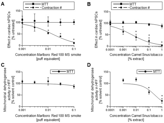 Effects of cigarette smoke and Snus smokeless tobacco on developing cardiomyocytes. (A) Contractile and viability screens for hiPSCs exposed to MS cigarette smoke using contractile and MTT assay, n = 3 ± SD. (B) Contractile and viability screens for hiPSCs exposed to Snus smokeless tobacco using contractile and MTT assay, n = 3 ± SD. (C) Viability screen for hFFs exposed to MS cigarette smoke using MTT assay, n = 3 ± SD. (D) Viability screen for hFFs exposed to Snus smokeless tobacco using MTT assay, n = 3 ± SD. hiPSC, human induced pluripotent stem cell; MTT, mitochondrial dehydrogenase activity assay; MS; mainstream; hFF, human foreskin fibroblast. *: p < 0.05 = the lowest concentration significantly below the untreated hiPSC control group as determined by One-Way ANOVA.