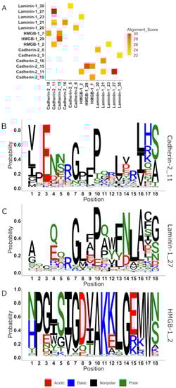 Sliding window comparison between the 90 motifs found in the three families of HNK-1 receptors. (A) Heat map depicting the 10 most similar motifs alignments between two motifs from different HNK-1 binding families. The higher the alignment score, the more similar are the sequences. (B) Sequence logo of the aligned similar sequences to cadherin-2 corresponding to the residues 168 to 185 and the 11th cadherin-2 family motif (arranged from 1 as the most probable to 30 less probable). (C) Sequence logo of the aligned similar sequences to laminin-1 corresponding to the residues 22 to 39 and the 27th laminin-1 family motif. (D) Sequence logo of the aligned similar sequences to HMGB-1 corresponding to the residues 117 to 134 and the second HMGB-1 family motif.