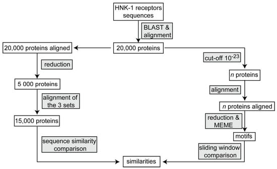 Flowchart of the steps involved in the study of the HNK-1 receptors. The workflow comprises two approaches using the results of the alignment of 20,000 proteins of each family (left branch). The 20,000 sequences were reduced to 5000 representative sequences and merged to form a 15,000 sequences group to be aligned. In the second approach (right branch)—after a second cut-off was applied (see also Table 1)—families were realigned and then used to find conserved sites.