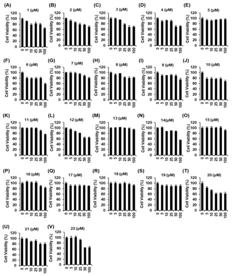 Effects of compounds 1–22 isolated from M. alba fruits on the viability of RAW 264.7 mouse macrophages. Effect of (A–V) compounds 1–22, compared with the control (0 µM), on the viability of RAW 264.7 mouse macrophages for 24 h by MTT assay.