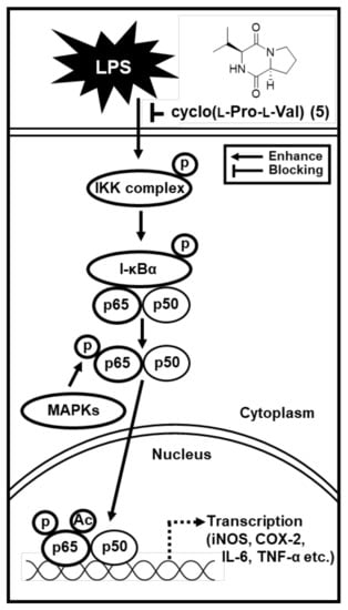 In summary, as part of an ongoing research project to discover bioactive natural products [,,,,,], phytochemical examination of the extract of M. alba fruits led to the isolation and identification of 22 compounds in the process of discovery of potential anti-inflammatory compounds. This study demonstrates that compound 5 inhibited NO production and iNOS and COX-2 in LPS-stimulated RAW 264.7 macrophages. At least in part, these inhibitory effects are mediated via inhibition of NF-κB/I-κBα pathway (Figure 6). Thus, these findings supported the utilization of cyclo(L-Pro-L-Val) (5) as a favorable candidate for the treatment of inflammatory diseases.