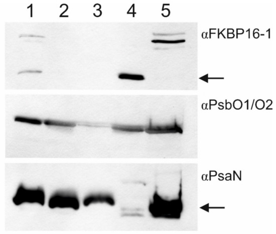 Estimation of the efficacy of free and membrane-associated lumen isolation. Western blot detection of FKBP16-1, PsbO1/PsbO2 and PsaN in thylakoid membrane and lumen fractions isolated during lumen preparations. 1—total thylakoids; 2—thylakoid membranes after removal of the free lumen fraction; 3—thylakoid membranes after removal of the membrane-associated lumen fraction; 4—free lumen; 5—membrane-associated lumen. Lanes 1–3 contain 10 µg protein, lanes 4–5 contain 30 µg protein. Arrows indicate protein of interest.