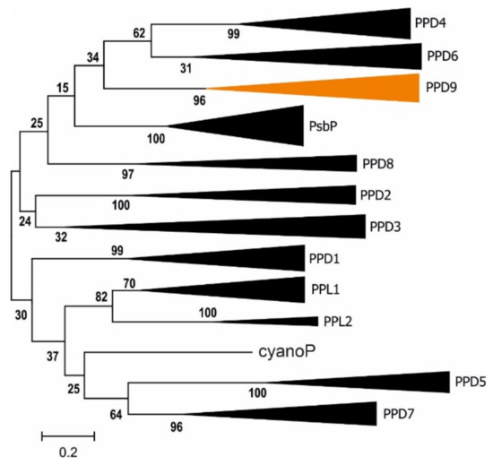 Phylogenetic analysis of PsbP families of 11 photosynthetic organisms. Compressed maximum likelihood tree shows relationships between full length putative PsbP domain-containing proteins isolated from the sequenced genomes of Arabidopsis thaliana, Oryza sativa, Amborella trichopoda, Medicago truncatula, Physcomitrella patens, Marchantia polymorpha, Selaginella moellendorffi, Volvox carteri, Ostreococcus lucimarinus, Chlamydomonas reinhardtii and Synechocystis sp. PCC 6803 (cyanoP; sll1418). Each node except cyanoP contains an orthologous group that is named according to homology with the corresponding PsbP domain-containing protein in Arabidopsis. The node corresponding to the novel PPD9 described here is colored in orange. Numbers show bootstrap values that indicate confidence in branching points. Scale shows substitutions per site.