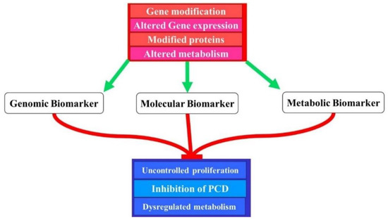 Different biomarkers may be identified as a result of various genetic and proteomic alterations. These alterations may lead to different pathologic conditions such as cancer by breaching proliferation marks, invading programmed cell death mechanisms and altering metabolism.