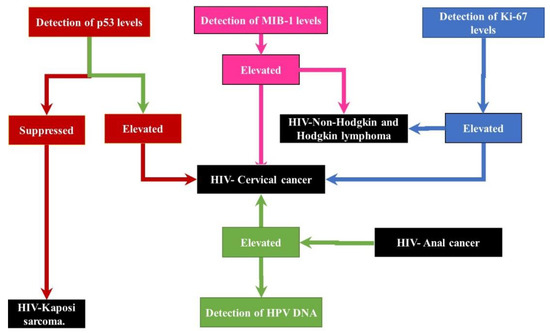 Diagnostic scheme for some HIV-associated cancers using specific biomarkers. The above diagram represents the use of the expression levels of p53, Ki-87 and MIB-1 proteins as well as the presence of HPV-DNA as diagnostic biomarkers. The expression levels of p53 can be used to diagnose Kaposi’s sarcoma (suppressed) and cervical cancer (elevated) [43,125]. The diagnosis of cervical cancer can be confirmed by the increased presence of HPV DNA as well as elevated levels of Ki-67 and MIB-1. While elevated levels of KI-76 and MIB-1 with no effects on p53 or presence of HPV DNA can serve as diagnostic markers for Non-Hodgkin lymphoma, the presence of HPV DNA without the increase of p53, Ki-67 or MIB-1 is indicative of anal cancer [34,63,139].