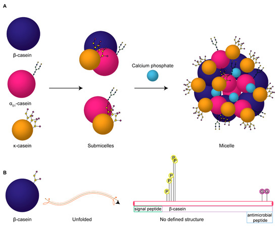 β-casein is a 226 amino acid (including the signal peptide), 25 kDa highly-phosphorylated protein. It makes up the majority of the casein micelle in human milk, followed by κ-casein and small amounts of αs1-casein. Structurally, a casein micelle consists of αs1-casein and β-casein forming an inner core, with κ-casein making up the outer glycosylated layer that stabilizes the micelle, see Figure 1 [16,17]. The inner region of the casein micelle remains uncertain, resulting in an undetermined structure of β-casein. Even so, the lack of disulphide bridges suggests the protein is likely to not have a tightly defined secondary or tertiary structure, whereas the abundant prolines in the sequence predispose it to an open conformation [16]. This overall open structure makes the protein readily accessible to proteolytic cleavage. Plasminogen, its activators, and its inhibitors, are reported to be associated with the casein micelle and are predominantly responsible for β-casein degradation in the mammary gland, and thus for producing the putative bioactive peptides [18].