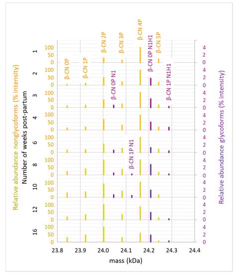 Deconvoluted mass spectra depicting the β-casein proteoforms identified in the whole milk of donor two throughout lactation. The non-glycosylated proteoforms (yellow) comprised phosphorylation in the range of 0–5P and were confirmed by database search of the intact protein LC-MS/MS results. Minor glycosylated proteoforms (~0–4% relative abundance of the most abundant β-casein proteoform; purple) could be annotated in the intact protein LC-MS data by the mass shift induced by the glycan residue masses.