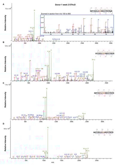 After applying strict automatic filtering criteria, we additionally inspected each potential phospho- and glycosite for the presence of the correct peptide fragments and fragments corresponding to phosphorylation and/or glycosylation. All automatically annotated glycosites on the N-terminus of the protein were found to lack supportive fragmentation evidence and were excluded from further analysis. We show in Supplemental Figure S2 (donor one, week 16, EThcD) the negative characteristics of spectra that were not included in the final interpretation of glycopeptide PSMs. Negative characteristics included the following: abundant peaks without annotation, nonsensical or high numbers of glycan species that are not supported by fragment series (e.g., more than triply glycosylated, but without corresponding oxonium ions) and an absence of peptide fragments with retained modifications (either for glycosylation or phosphorylation).