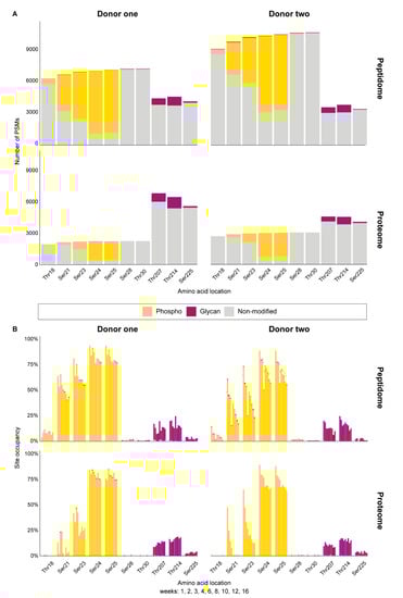 Semi-quantitative analysis of phosphorylated and glycosylated amino acids detected in β-casein across lactation. (A) Total number of detections of Thr18, Ser21, Ser23, Ser24, Ser25, Ser28, Thr30, Thr208, Thr214, and Ser225 for each donor in either the peptidome and proteome, colored for the presence of phosphorylation (yellow), glycosylation (purple), or without modifications (grey). (B) Percentage of modified amino acids amongst the total number of detections, separately displayed for lactation weeks 1, 2, 3, 4, 6, 8, 10, 12, and 16. While the observed PTMs are donor-specific, overall, the peptidome data displays a greater relative abundance of phosphorylated and glycosylated sites than the proteome data, and highly similar changes can be seen across lactation for both donors. Whereas all phosphorylation sites are near the N-terminus, the O-glycosylation sites are all at the C-terminus of β-casein.