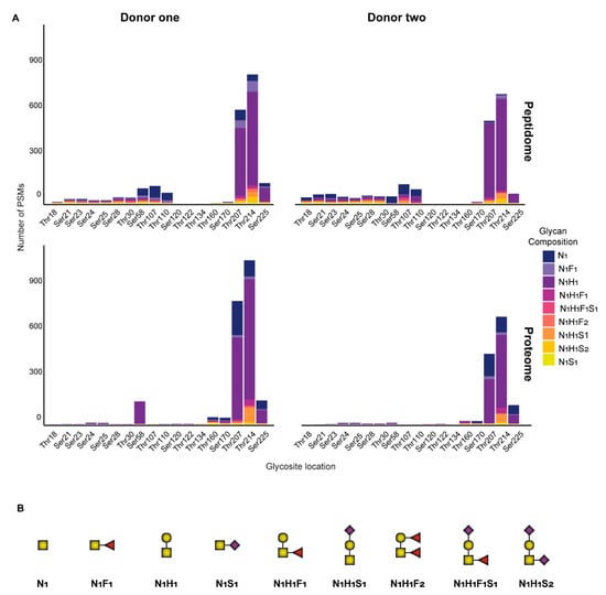 Notably, the stoichiometry of glycosylation changed throughout lactation, a feature even more intense in the peptidome than the proteome. For instance, for both donors in the proteome, glycosite occupancy remained rather consistent, with Thr207 at 10% and Thr214 at 16% (Supplemental Table S4). However, for both donors in the peptidome, there was a clear declining trend in these site occupancies over lactation. An exception to this trend was observed in donor one at week 6 which had site occupancies spike back to the values observed at week 1. This aberrant milk composition at one point in time from donor one corresponded to a potential maternal infection, as previously reported in detail [41]. Interestingly, the glycans occupying these two sites are predominantly made up of three species—N1H1, N1, and N1F1 (in order of highest to lowest PSM counts)—regardless of being identified in the proteome or peptidome Figure 6.