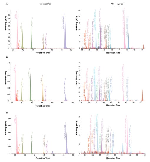 Changes in abundances of O-glycosylated peptide variants during early and late lactation. All presented ion traces originate from donor one and show the C-terminal β-casein ladder peptide series beginning with 190AVPVQALLLNQ ELLLNPTHQIYPVTQPLAPVHNPISV226 and ending with the antimicrobial peptide 200QELLLNPTHQYPVTQPLAPVHNPISV226. All ladder peptides are decorated by different O-glycan species, as containing a single glycan on Thr207 or Thr214, or having both sites occupied. All ladder peptides were found decorated with N1, N1H1 or N1H1S1 glycan species. Precursor ion traces are depicted as non-modified (left) and glycosylated (right). (A) MS1 traces of the differing glycopeptides relative to the non-modified peptide in week 1. (B) MS1 traces of the differing glycopeptides relative to the non-modified peptide in week 6. (C) MS1 traces of the differing glycopeptides relative to the non-modified peptide in week 16.