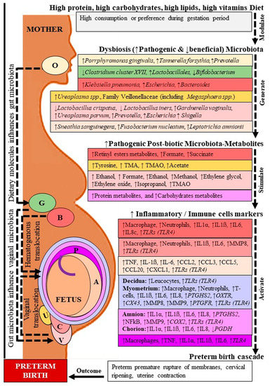 The generation or availability of microbial metabolites is directly influenced by the dysbiosis of the microbial population, which in turn is affected by environmental factors, especially diet [36]. During pregnancy, microbiota-generated post-biotic metabolites concentration depends upon microbial richness and diversity in different bio-fluids (blood, urine, cervicovaginal fluid, amniotic fluid), which are associated with PTB (Table 3). It has been reported that the levels of polyamines that are associated with mothers’ dietary intake are higher in the preterm women’s breast milk [107]. Alcoholic and acetone microbial metabolites are harmful to the birth outcome. Exposure to a low level of methanol can shorten the pregnancy and promote labour complications, while ethylene metabolite, i.e., ethylene oxide may increase the risk of spontaneous abortion, PTB, and post-term birth. It has been found that the consumption of natural highly sugar-sweetened (e.g., fructose) or artificially sweetened (e.g., aspartame) beverages may be likened to an increased risk of PTB. Aspartame breaks down into methanol and other substances in the body, which in turn can be converted into toxic metabolites such as formaldehyde and formate that adversely affect PTB [23]. LPS is a microbiota endotoxin, which acts on TLRs and induces PTB [108]. The high protein content of the amniotic fluid observed in the second-trimester is also considered as one of the contributing factors for PTB [109] since the high level of protein metabolites TMA/TMAO in the second-trimester are known to be associated with PTB [23].
