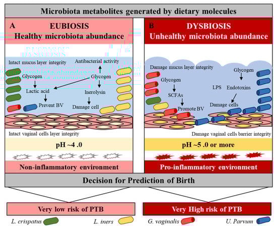 The abundance of Bacteroides and Escherichia-Shigella were observed in the blood, while the dominance of BV-associated Leptotrichia/Sneathia, Mobiluncus spp., and Mycoplasma spp. was reported in the vagina of PTB women [35,51,57]. A high level of Lactobacillales was observed in the feces and an abundance of Weissella and Rickettsiales were observed in the blood of women who reached full term [35,58]. The abundance of Ureaplasma spp. and the family Veillonellaceae (including Megasphaera spp.) was observed in the urine of PTB women [59]. The BV strains Sneathia sanguinegens and Fusobacterium nucleatum were identified in amniotic fluid samples at mid-trimester of women with PTB [60]. The low levels of Clostridium subcluster (XVIII, XIVa) and Bacteroides and a high level of Lactobacillales were observed in the feces of the PTB [58]. In pregnancy, the oral microbiota generally exhibits a relatively stable bacterial population to the vaginal microbiome. However, one study has revealed that high levels of common periodontal pathogens Porphyromonas gingivalis, Tannerella forsythia, Prevotella intermedia, and Prevotella nigrescens are associated with an increased risk of PTB [61]. Lactobacillus crispatus and Lactobacillus iners have a protective role against pathogenic microbiota such as Gardnerella, Ureaplasma, Closteridiam, and Provetella through beneficial metabolites to prevent virginal dysbiosis, maintain vaginal pH, and protect mucus layer integrity [62,63]. Furthermore, subjects with high concentrations of Lactobacillus crispatus at follow-up had high concentrations of metabolites negatively associated with BV, which affected their pregnancies (Figure 2, Table 1) [38,52,56,64].