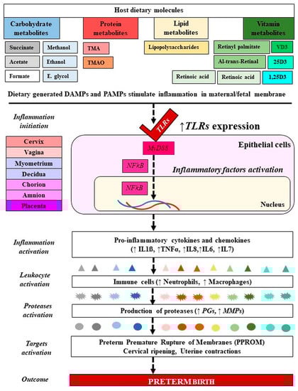 As mentioned before, TLRs (TLR2, TLR3, TLR4, TLR5, TLR6) play an important role in the inflammatory activation processes by binding to the PAMPs or DAMPs [79]. These molecules serve as upstream mediators of the synthesis of inflammatory cytokines and chemokines in infections/inflammation-induced PTB [148]. The metabolites that belong to PAMPs (endotoxins and exotoxins) activate PRRs such as TLRs and nod-like receptors that are expressed by amnion epithelial cells, intermediate trophoblasts in the chorion, decidual cells, macrophages, and neutrophils. LPS, an endotoxin and an essential component of the outer membrane of Gram-negative bacteria, acts on TLRs, manifesting a strong response to immune systems and an induction of PTB [108,149]. The PRRs induce the pleiotropic NFκB signal transduction pathway which regulates the expression of proinflammatory chemokines (e.g., IL8 and C-C motif ligand 2 (CCL2)), cytokines (e.g., IL1β, IL6, TNFα, IFNγ), prostaglandins, and proteases, leading to activation of the common pathway of parturition [118,125] (Figure 4).