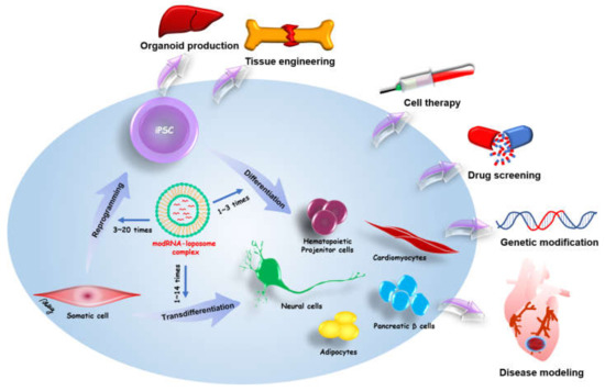Exogenous proteins can drive somatic cell reprogramming and transdifferentiation for iPSC-related medicine. Therefore, a safe and effective method is required for use in research and medicine. Initially, the most common method for exogenous protein expression depended on viral integrative methods, which have the risk of genomic mutation through the integration of transgenes into the host genome. The modified mRNA of in vitro transcription provides non-integrative and footprint technology for target protein expression. modRNA can directly drive specific cell fate and cell reprogramming from various somatic cells. Moreover, a modRNA cocktail can be designed to simultaneously induce multiple different proteins in somatic cells. The in vitro transcription has benefits for greater flexibility, control over stoichiometric ratios, and dose titrations. The modRNA-based reprogramming and transdifferentiation hold great promise in iPSC-related regenerative medicine and disease modeling. Schematic overview of modRNA applications in cell fate conversion and potential therapies of modRNA-induced cells is shown in Figure 2.
